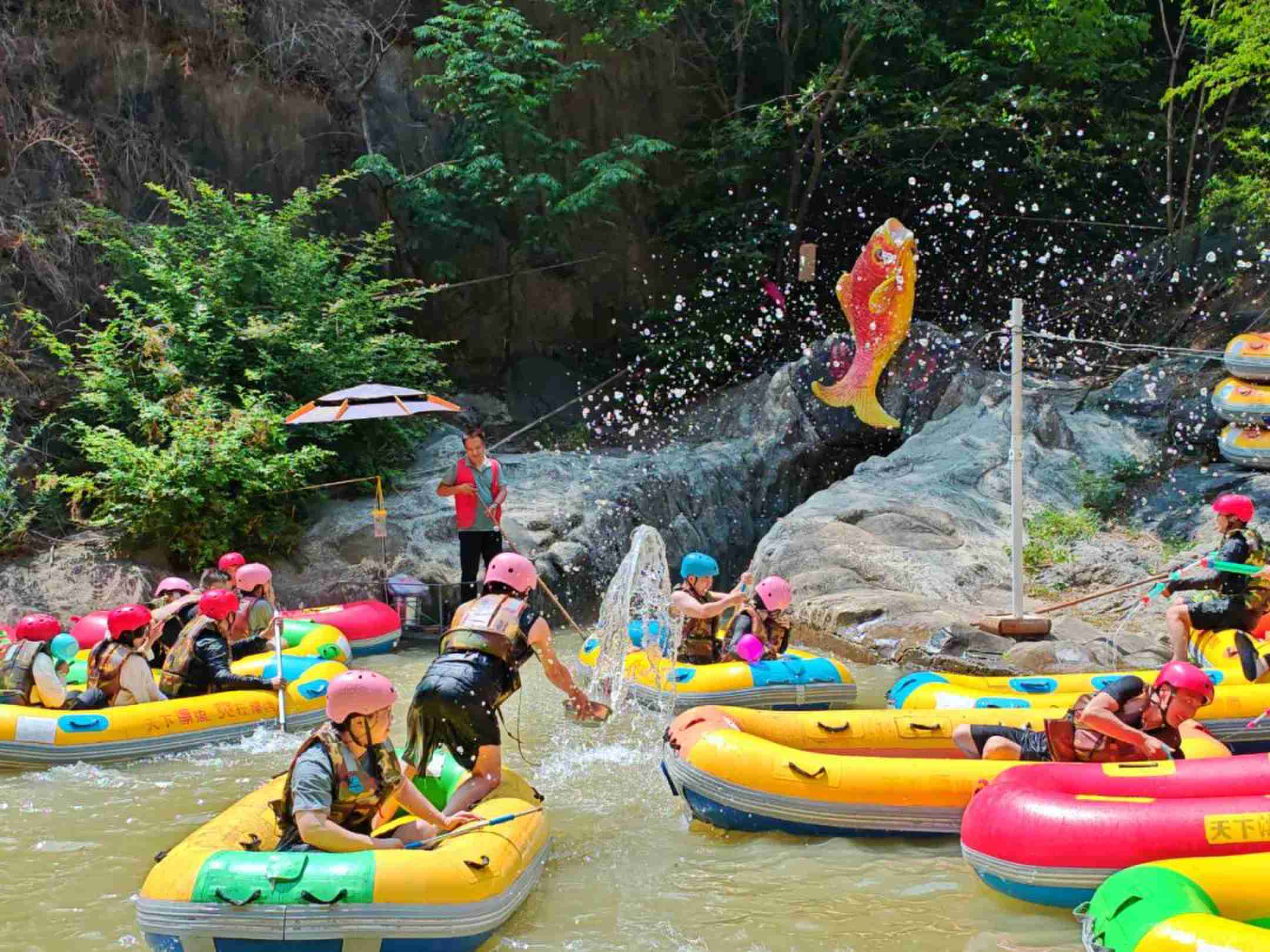 乘坐皮筏艇,在清凉的漂流河道里俯冲,急流裹着浪花劈头盖脸砸来心跳狂飙,在峡谷S弯道被浪戏弄,处处都是尖叫和欢笑声,水枪水瓢无差别上阵,泼透一身清凉才是真痛快!白天浪花里尖叫,夜晚烟火下干杯,多备一套干衣服,晚上撸串更潇洒。