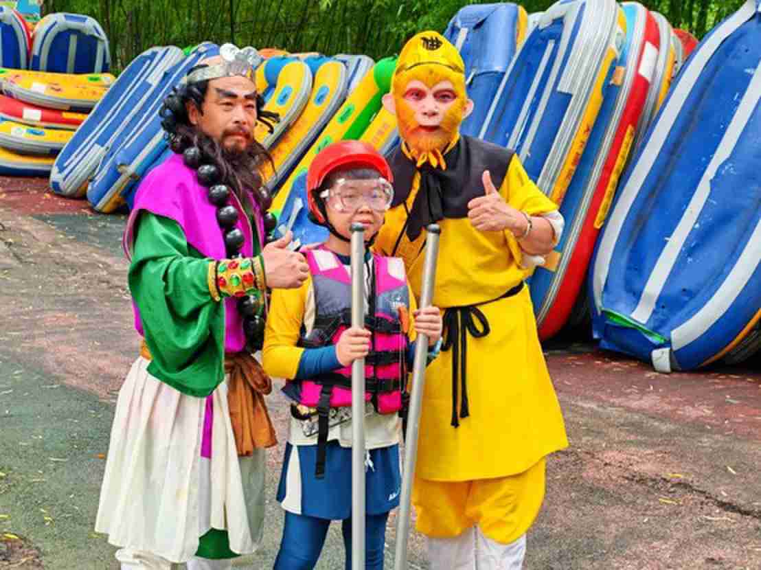 在漂流码头,平日里只在屏幕里见过的唐僧师徒四人集体现身——手持禅杖的唐僧温和浅笑,扛着金箍棒的孙悟空灵动俏皮,挺着大肚腩的猪八戒憨态可掬,挑着担子的沙和尚稳重亲切。这波“回忆杀”刚登场,就瞬间点燃了现场气氛,大人小孩都忍不住欢呼起来。